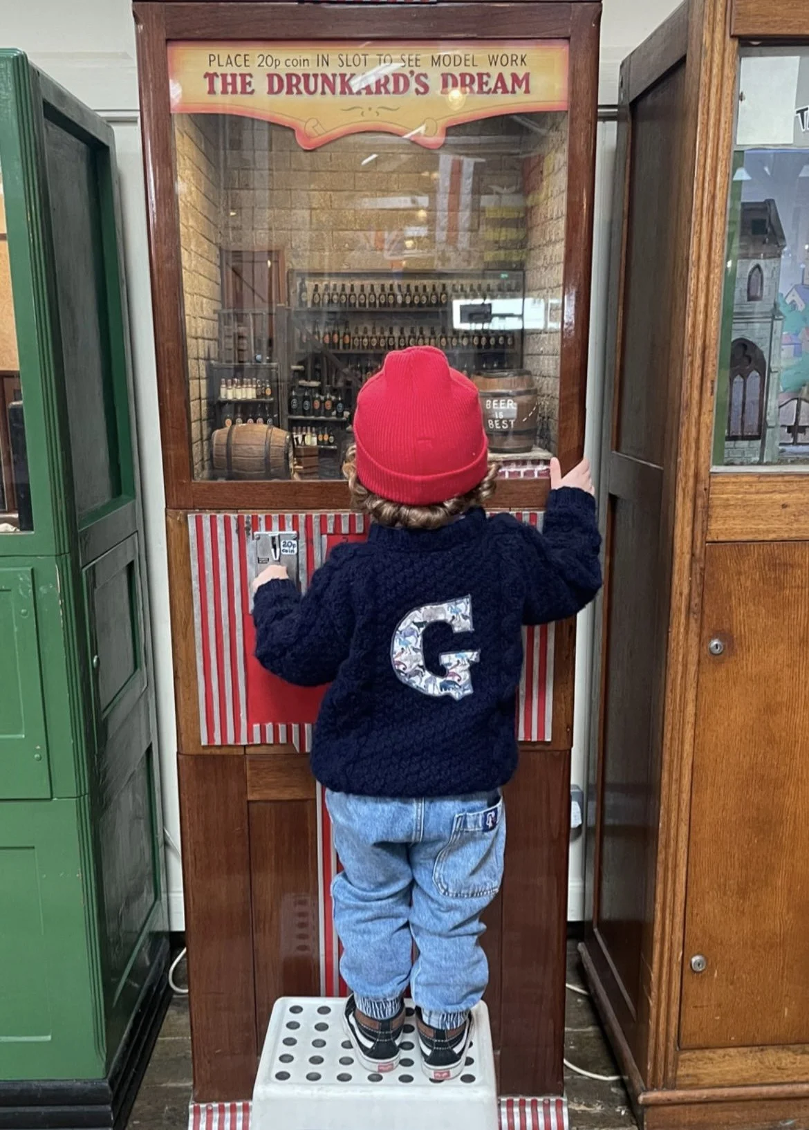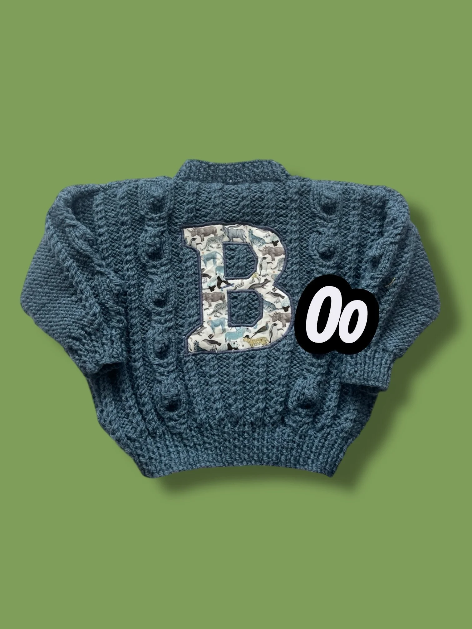 The Original Mimi Odette Hand Knitted Personalised, Liberty of London fabric initial cardigan, Bows and Banners from Newborn to age 10 years. Made by hand in Yorkshire, featured in British Vogue.