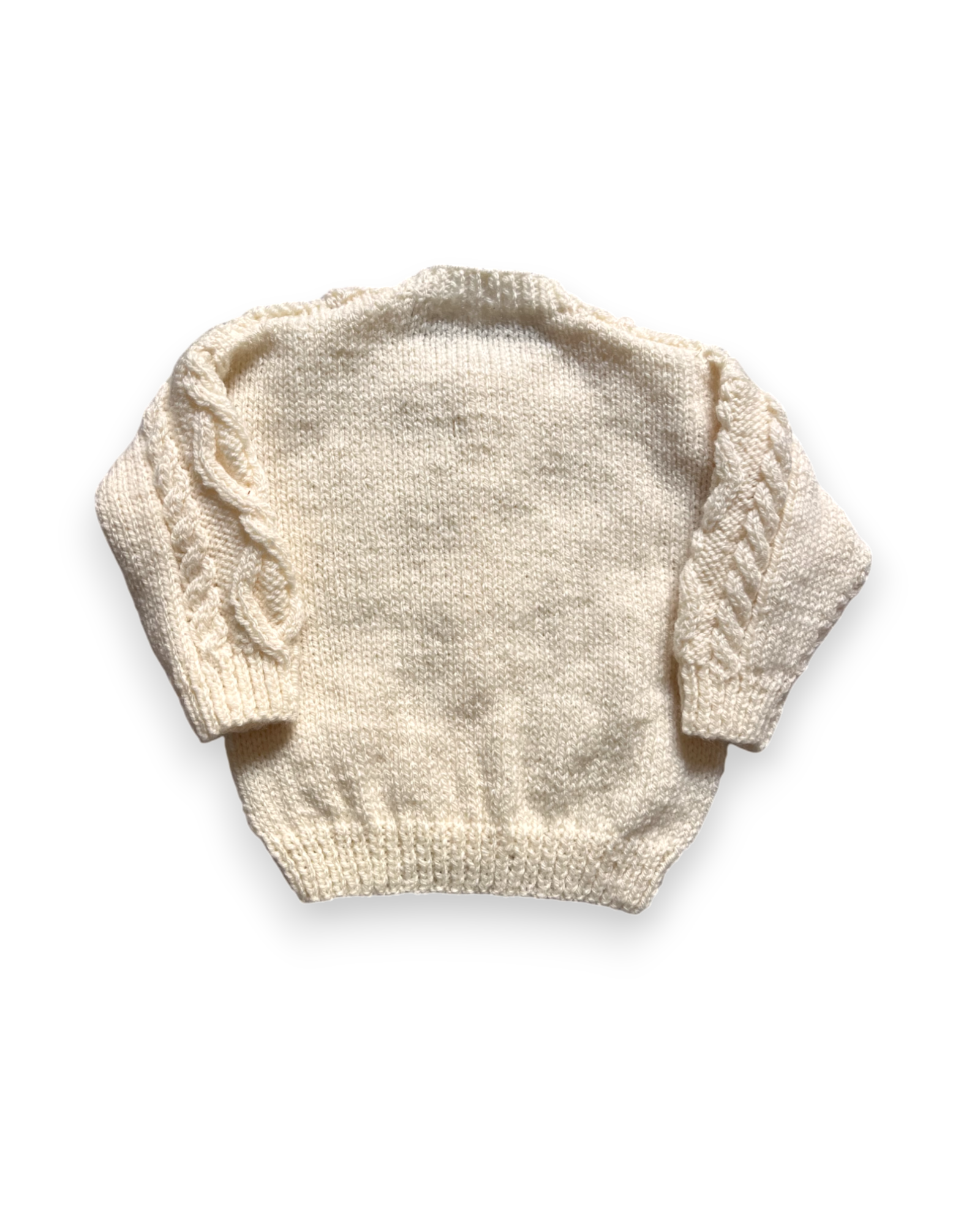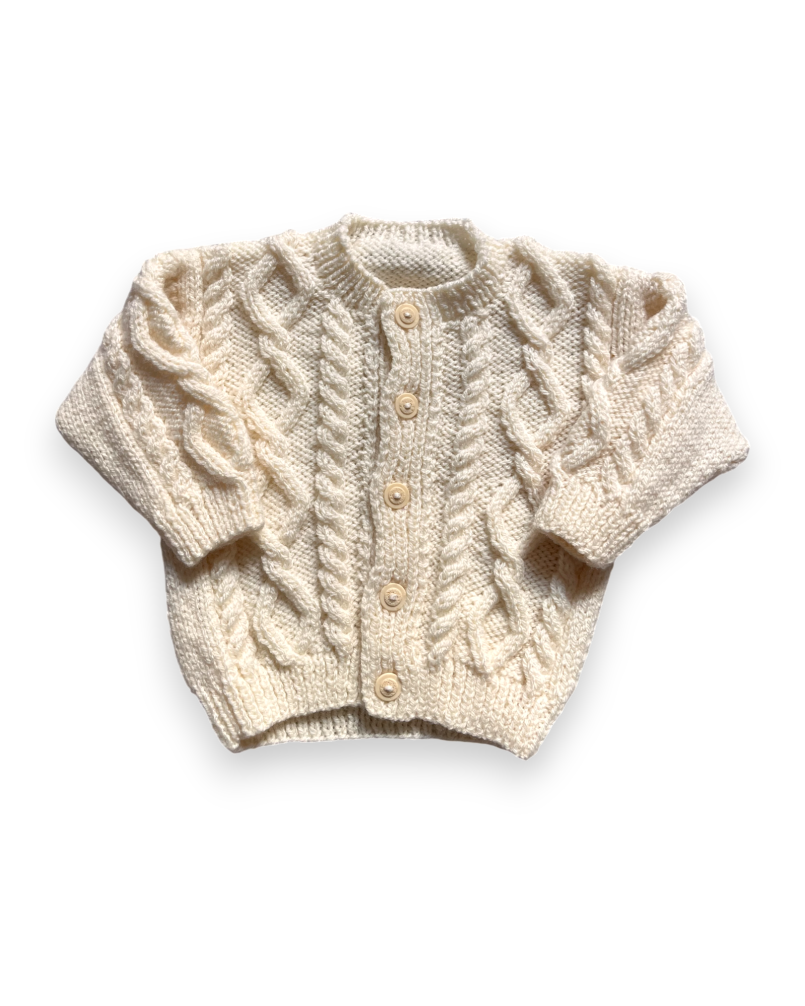 Hand knitted cardigan in a Cream yarn. Featuring cream buttons. Each item is gift wrapped in white tissue paper and tied with a ribbon.